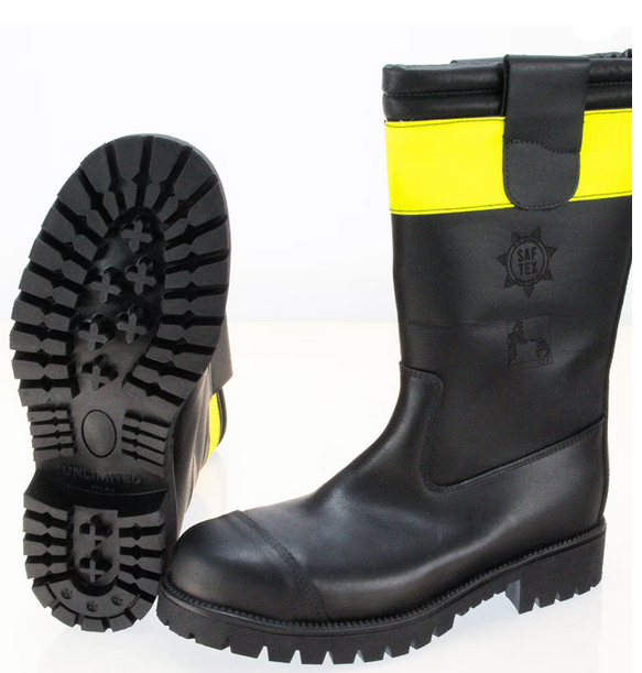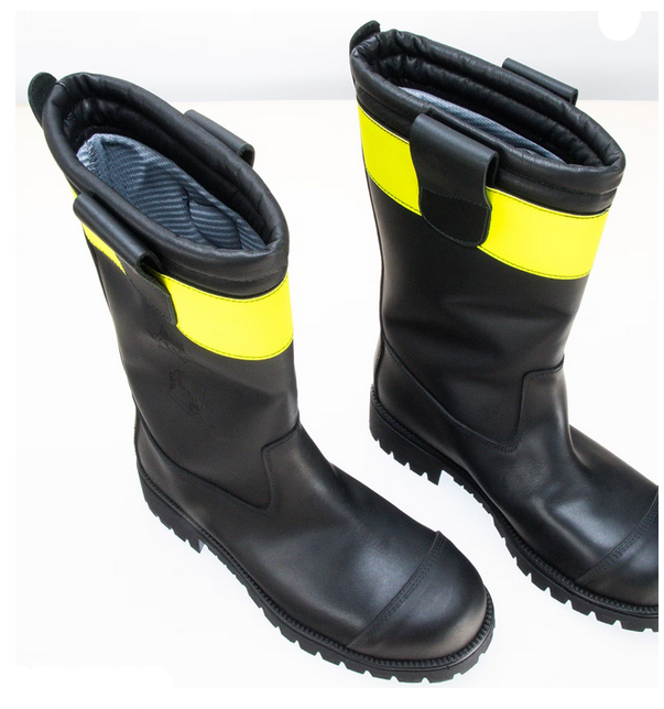 Bande réfléchissante externe sur talon : En gris ou jaune fluo, matériau ignifuge de très grande visibilité.