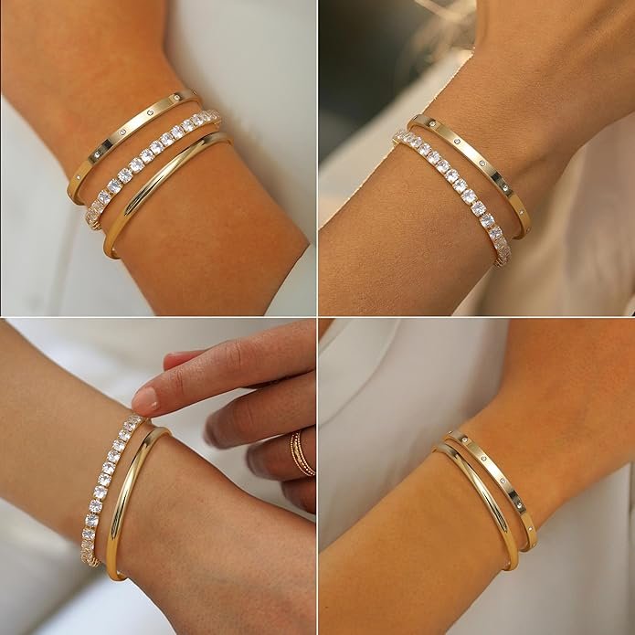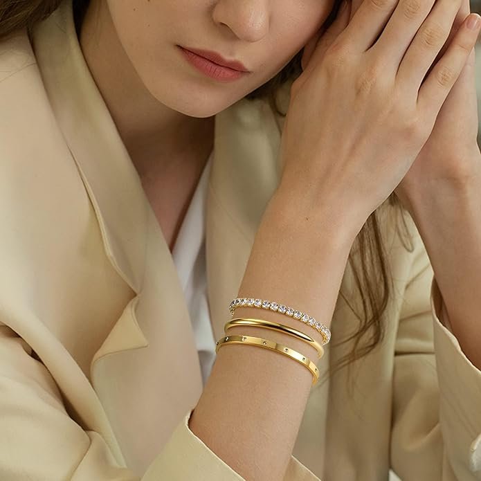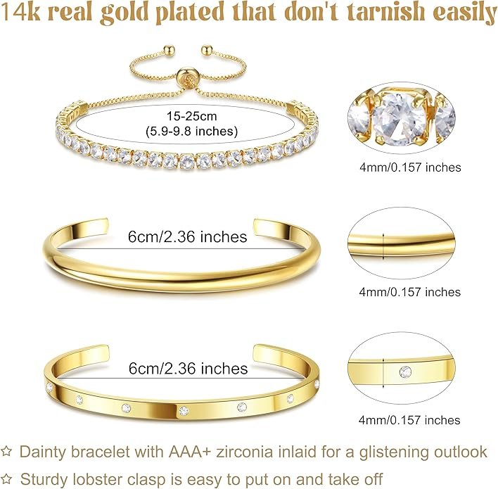 -Bracelets en Or 14 Carats pour Femme Chaque commande comprend trois bracelets or femme : un bracelet en or, un bracelet manchette classique brillant et un bracelet tennis en zircon. Vous pouvez les porter individuellement ou les empiler pour un look simple et exquis.