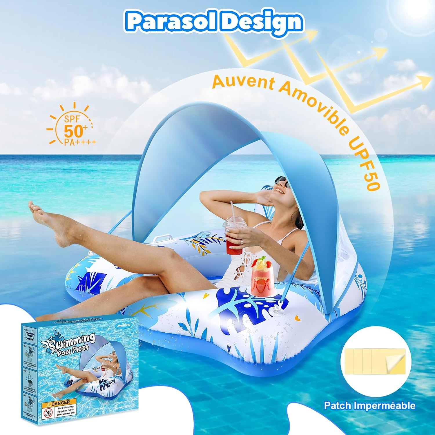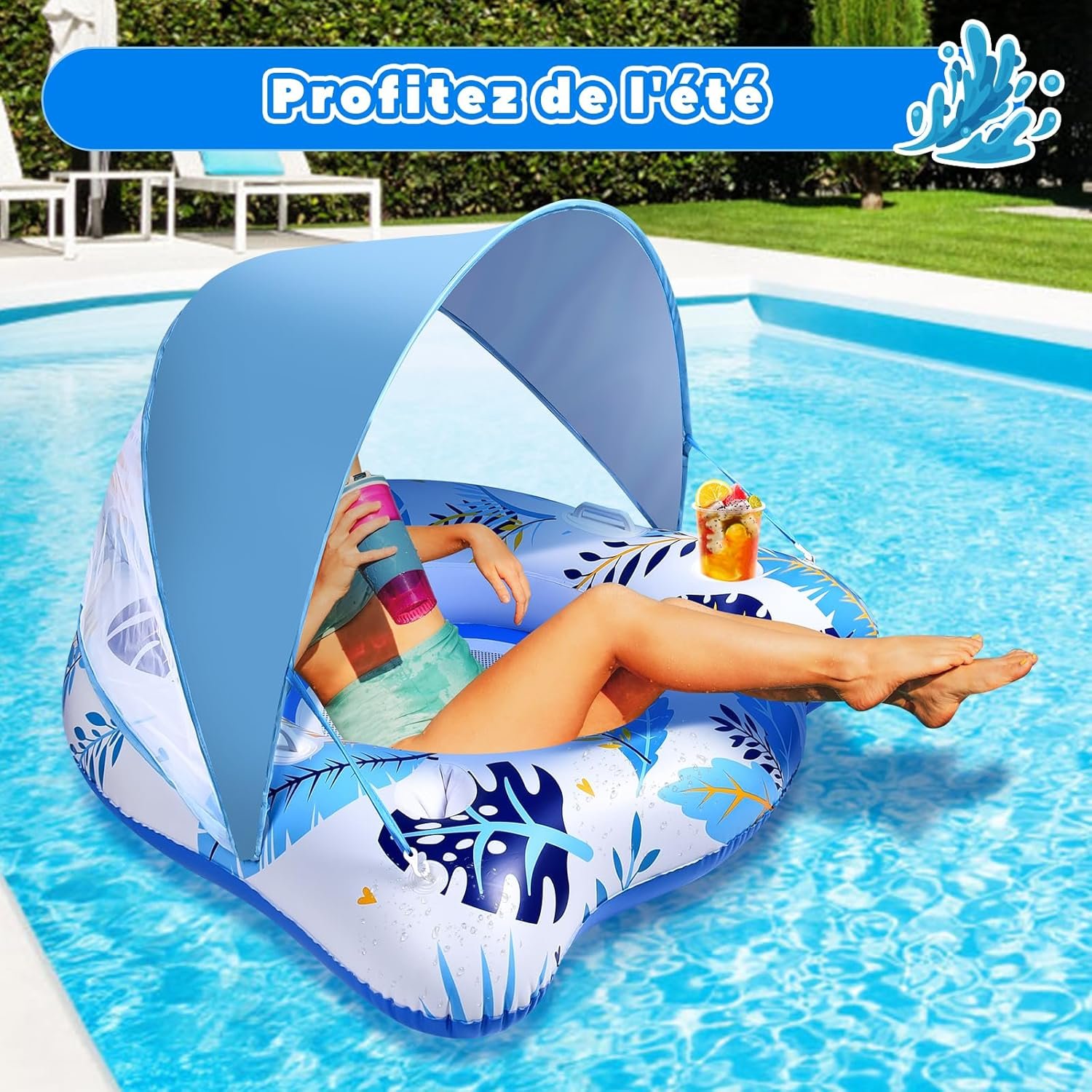 Bouée gonflable adulte avec auvent – Flotteur de piscine avec porte-gobelets, poignées et pare-soleil UPF50+