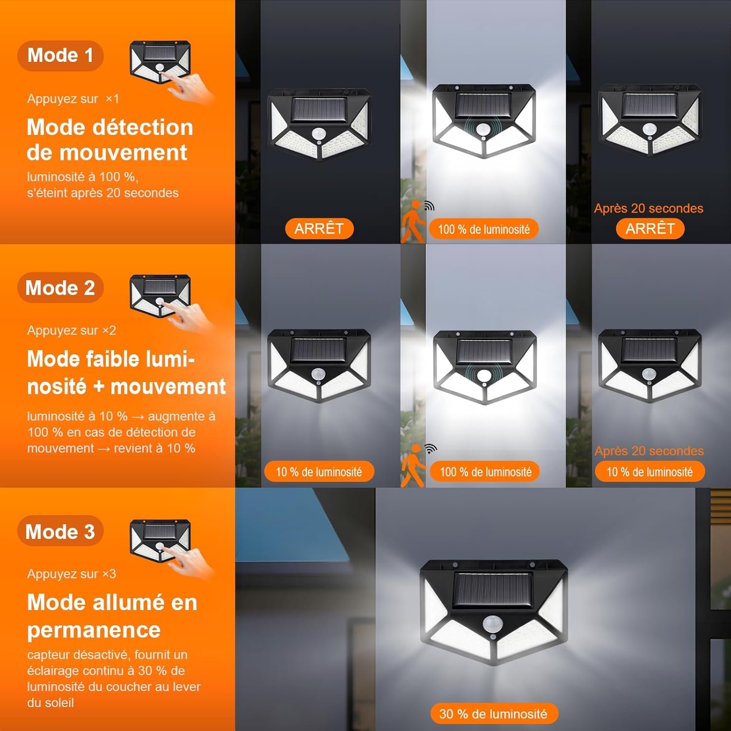 ampe Solaire Extérieur avec Détecteur de Mouvement, Spot Solaire Extérieur LED pour Jardin, 100 LEDs, 3 Modes, Angle 270°, IP65, Batterie 800mAh