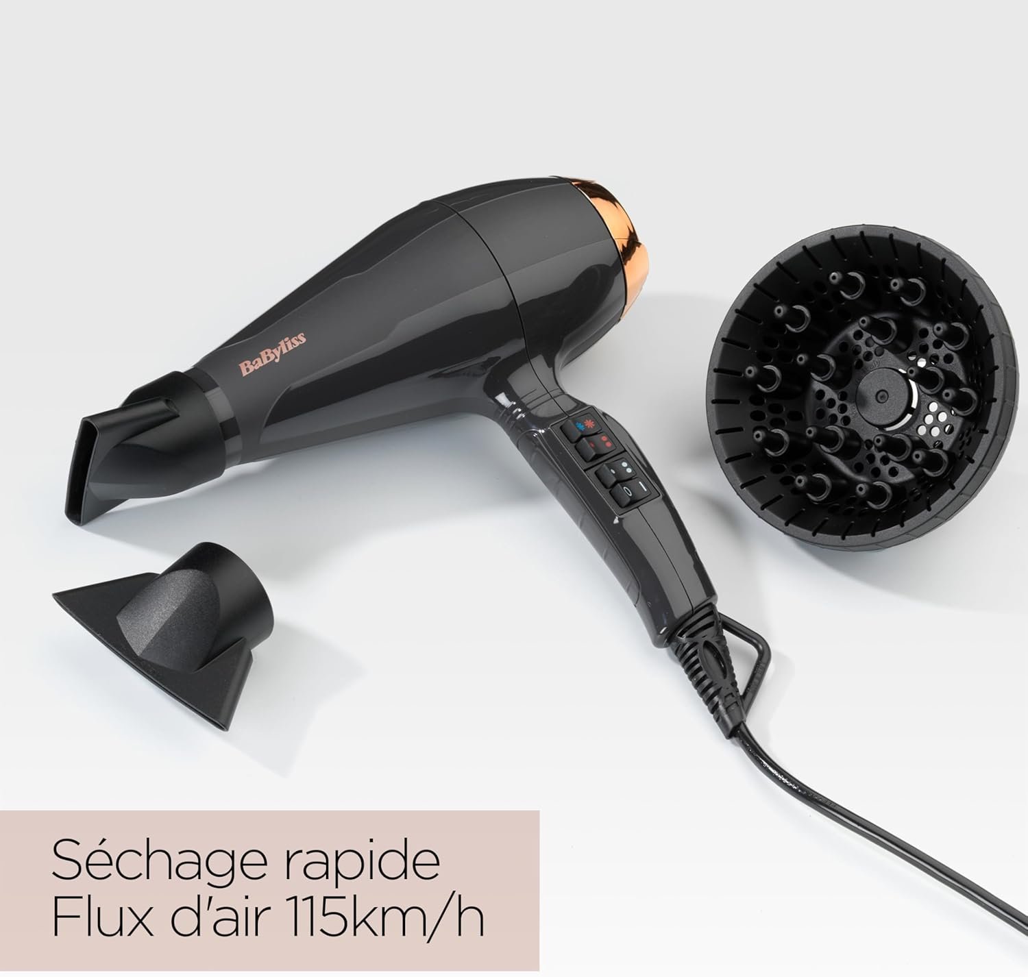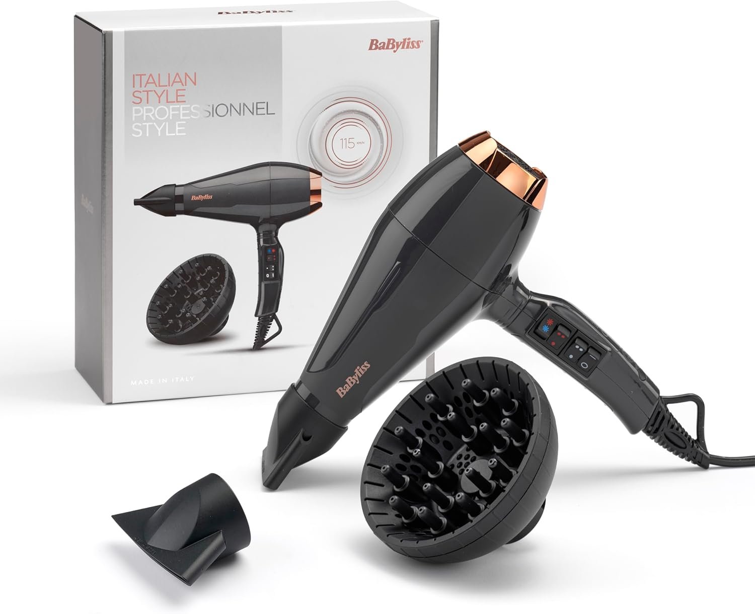 Sèche-cheveux Air Pro avec Diffuseur - Fabriqué en Italie, Moteur Professionnel AC, Sèche-cheveux puissant 2200W, Technologie ionique Anti-Frisottis, 2 températures & 2 vitesses, Noir, 6719DE