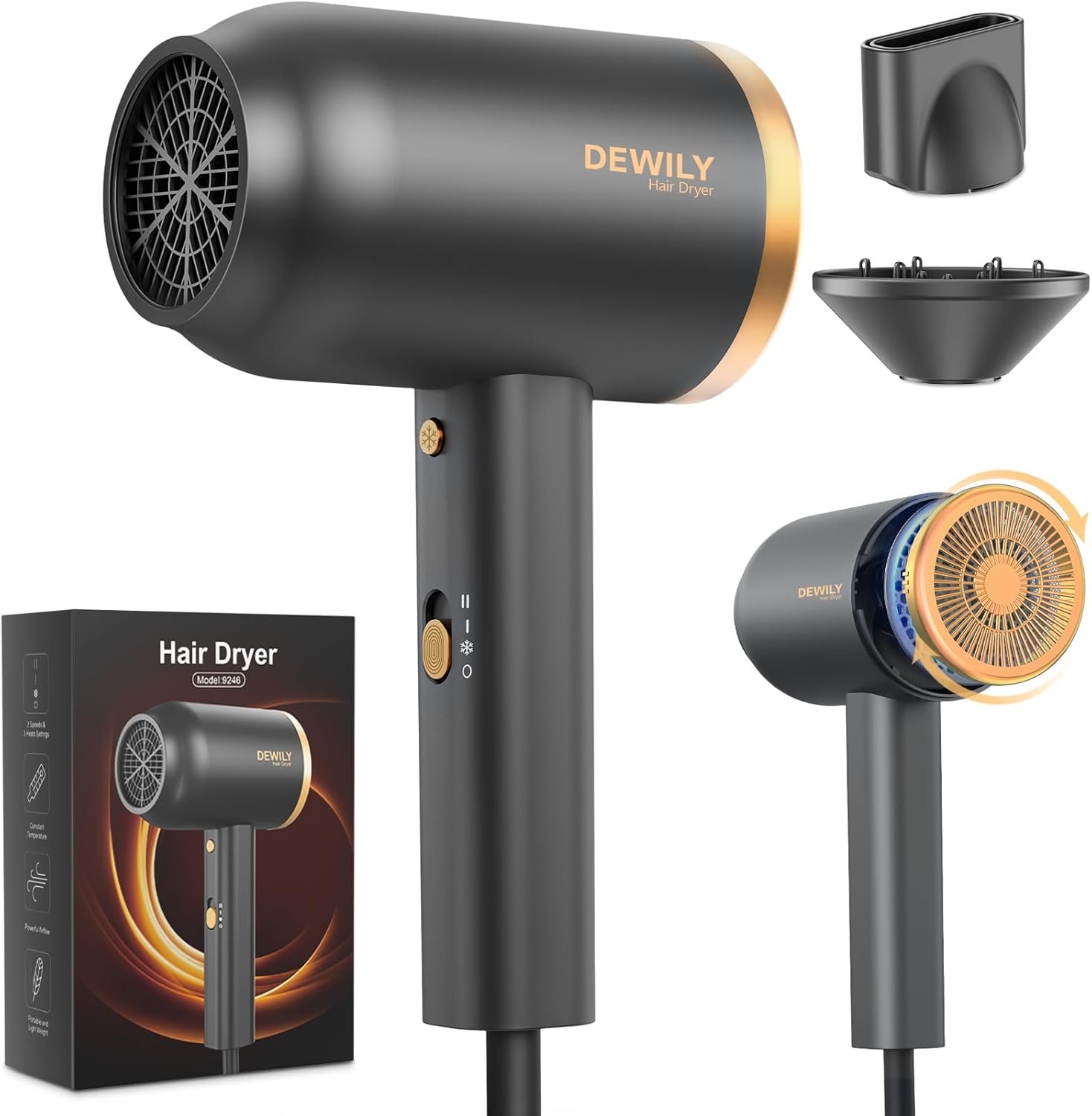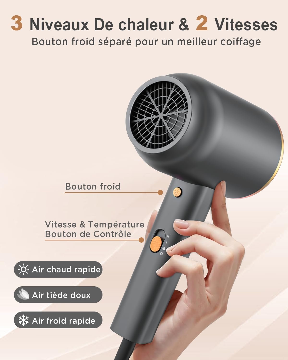 Sèche-cheveux ionique avec diffuseur - 1800W Séchage rapide, bouton chaud/froid, 3 températures, 2 vitesses, concentreur, fonction pour boucles,diffuseur thermostatique,Or et Noir