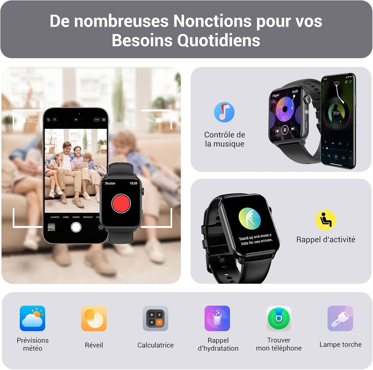 Montre Connectée Garçon 2025 | Appel Bluetooth & Voyants LED | Surveillance Fréquence Cardiaque et du Sommeil | Batterie de 350 mAh | Autonomie de 6+ Jours | Deux Bracelets