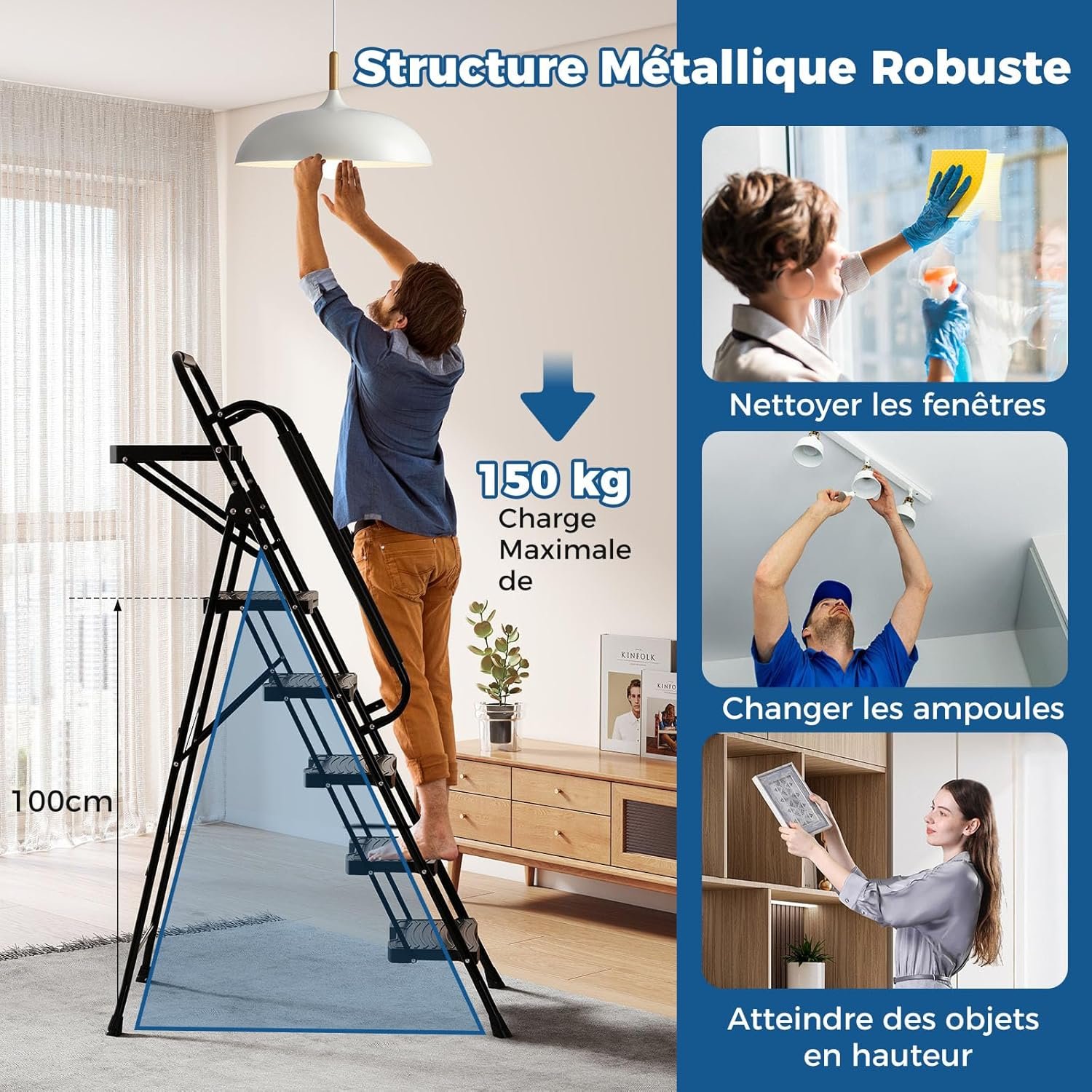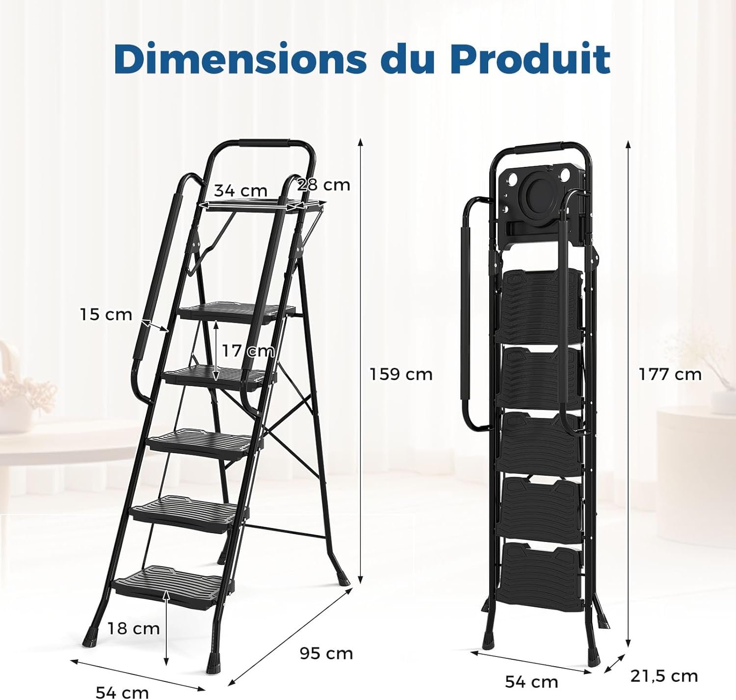 Escabeau Métallique 5 Marches avec Plateau Porte-Outils, Échelle Pliante avec Pédales Larges