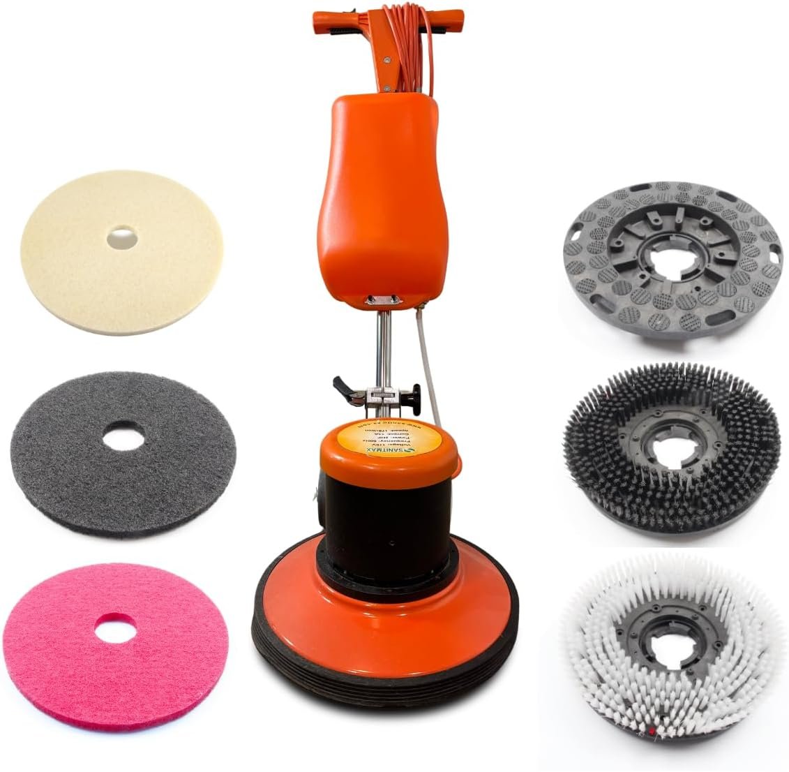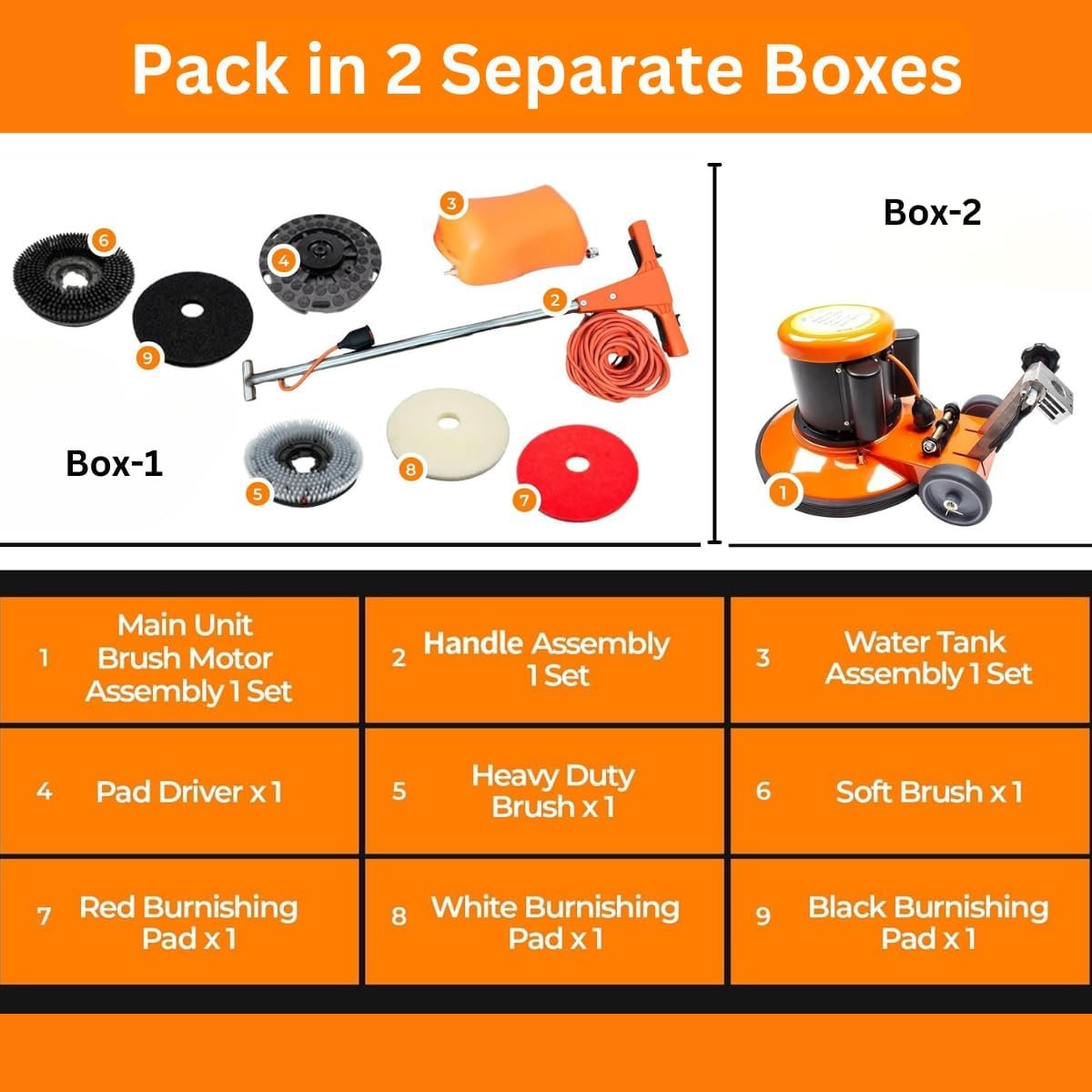 Included Components: Handle Assembly*1 Set, Heavy Duty Brush*1, Soft Brush*1, Main Unit/Brush Motor Assembly*1 Set, Pad Driver*1, Red, White, Black Burnishing Pad*1 each, Water Tank Assembly*1 SetHandle Assembly*1 Set, Heavy Duty Brush*1, Soft Brush*1, Main Unit/Brush Motor Assembly*1 Set, Pad Driver*1, Red, White, Black Burnishing Pad*1 each, Water Tank Assembly*1 Set