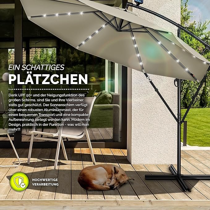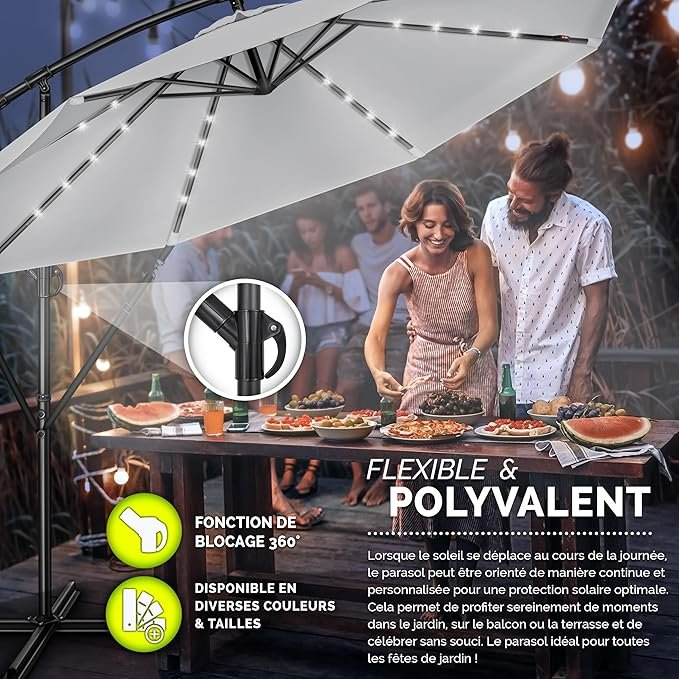 Parasol déporté LED solaire hexagonale 3M avec manivelle | Pare-soleil avec pied | Protection UV en aluminium pour le jardin | Parasol à manivelle pour le marché déperlant